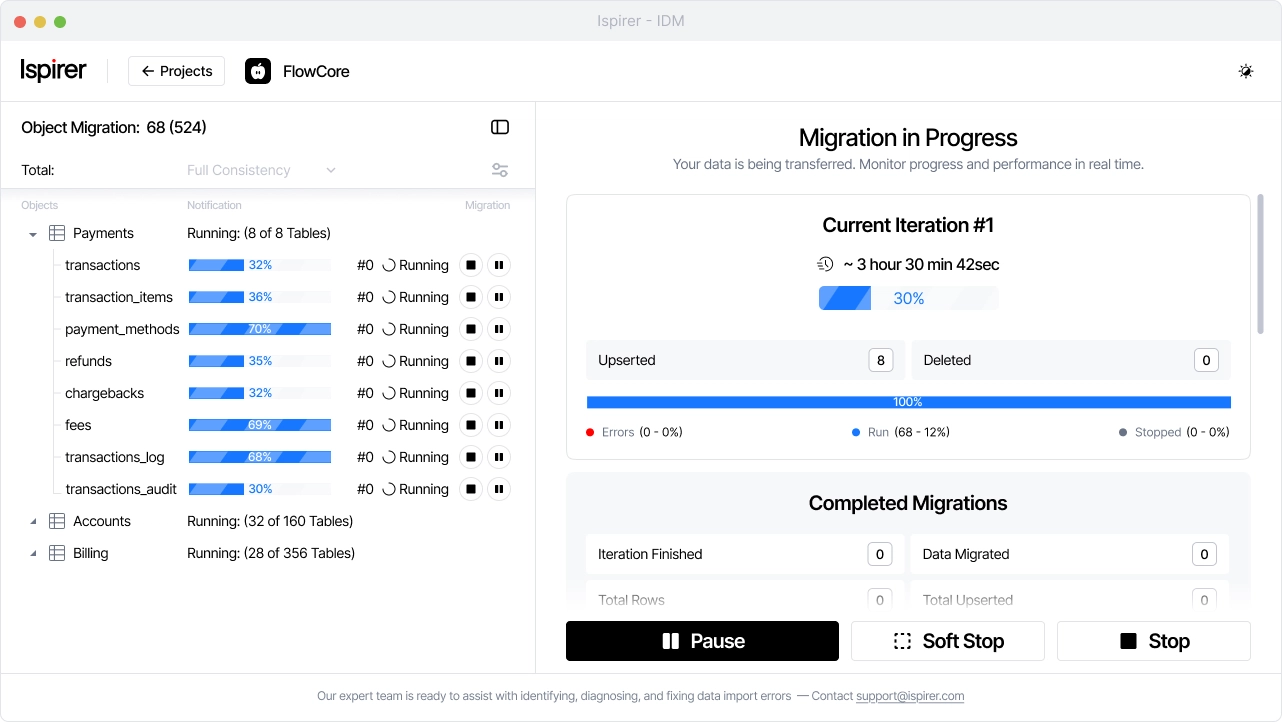 Ispirer Data Migrator simplifies data migration at every stage – from initial data load to real-time synchronization. Built for enterprise-scale scenarios, it eliminates downtime, prevents data loss, and removes the need for manual adjustments.